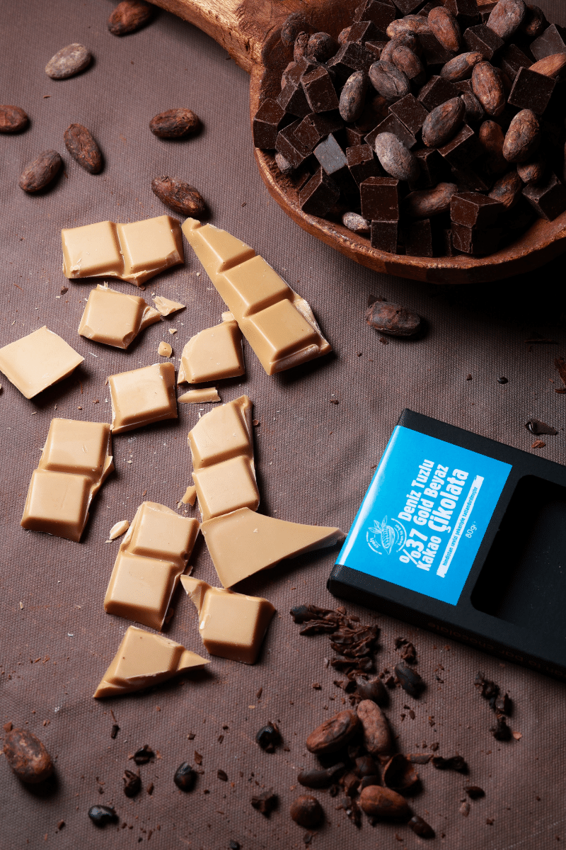 Deniz tuzu ile tatlandırılmış, hindistan cevizi şekerli beyaz cikolata. Aroha Çikolata ile tadı-tuzu yerinde bir çikolata. Salted Caramel çikolata tadında.